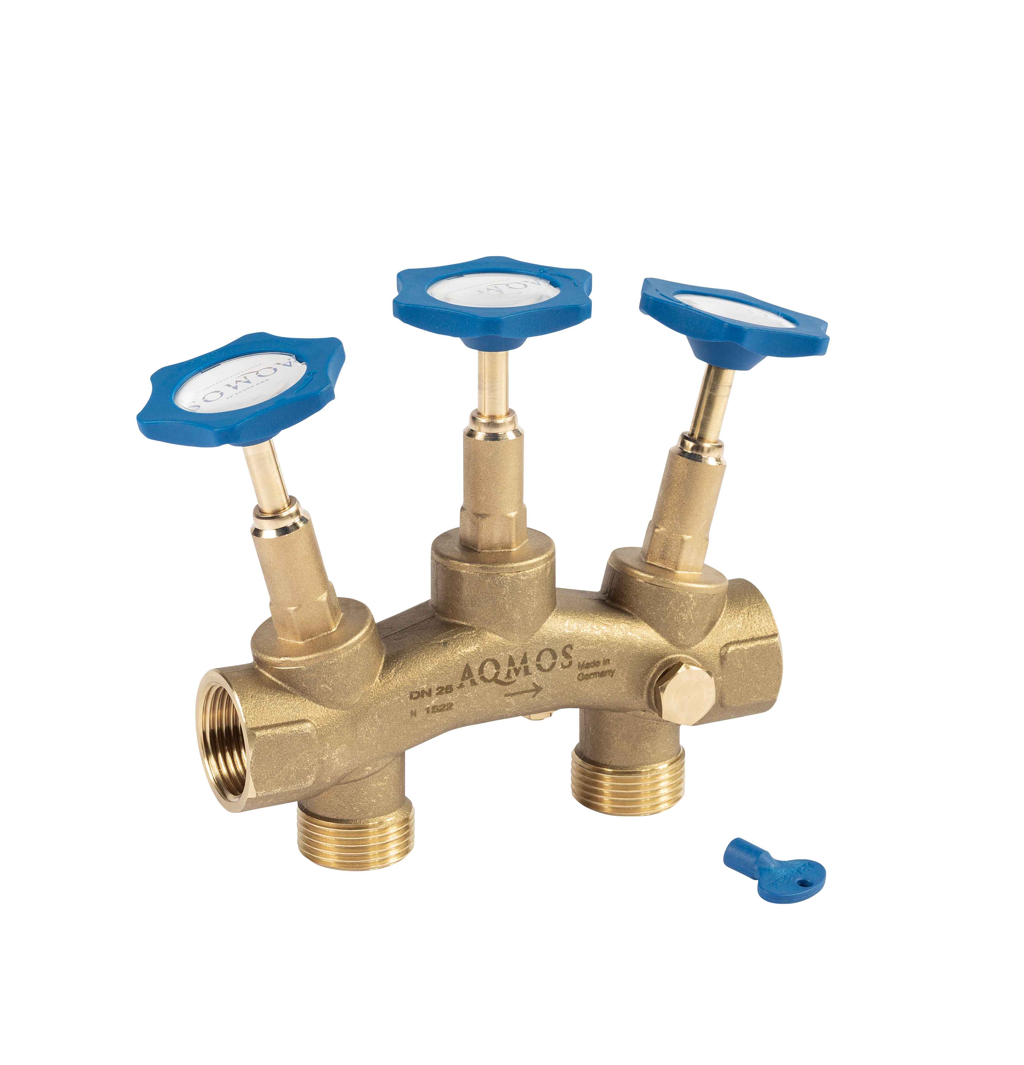 Montageblock mit Bypassfunktion ohne Verschneideeinrichtung mit Probeentnahmehahn für Enthärtungsanlagen. Der Montageblock wird als kombinierte Anschlussarmatur für Enthärtungsanlagen eingesetzt. Der Montageblock kann vertikal als auch horizontal eingebaut werden. Außerdem kann die Fließrichtung von rechts nach links oder auch von links nach rechts genutzt werden. Der Montageblock muss hierzu lediglich gedreht werden. Der Montageblock besitzt drei Stellventile. Mit den äußeren zwei kann der Zu- und Abfluss des Enthärters abgesperrt werden, sollte der Enthärter zu Servicezwecken o.ä. entfernt werden. Das mittlere Ventil dient als Bypass. Damit Proben für die Wasserhärtebestimmung entnommen werden können, ist die Bypass-Strecke mit einem Entnahmeventil versehen.