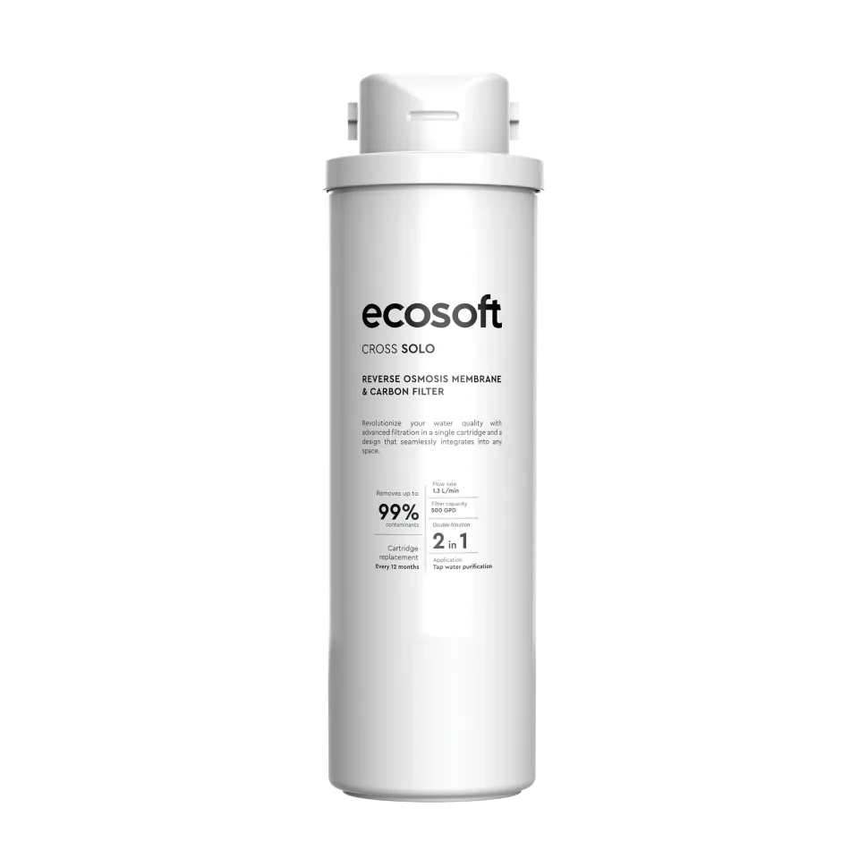 Das Membranelement und der Aktivkohlefilter für den CROSS Solo verwenden ein fortschrittliches 2-in-1-Filtersystem, das eine gründliche Wasserreinigung in zwei wichtigen Schritten gewährleistet:
