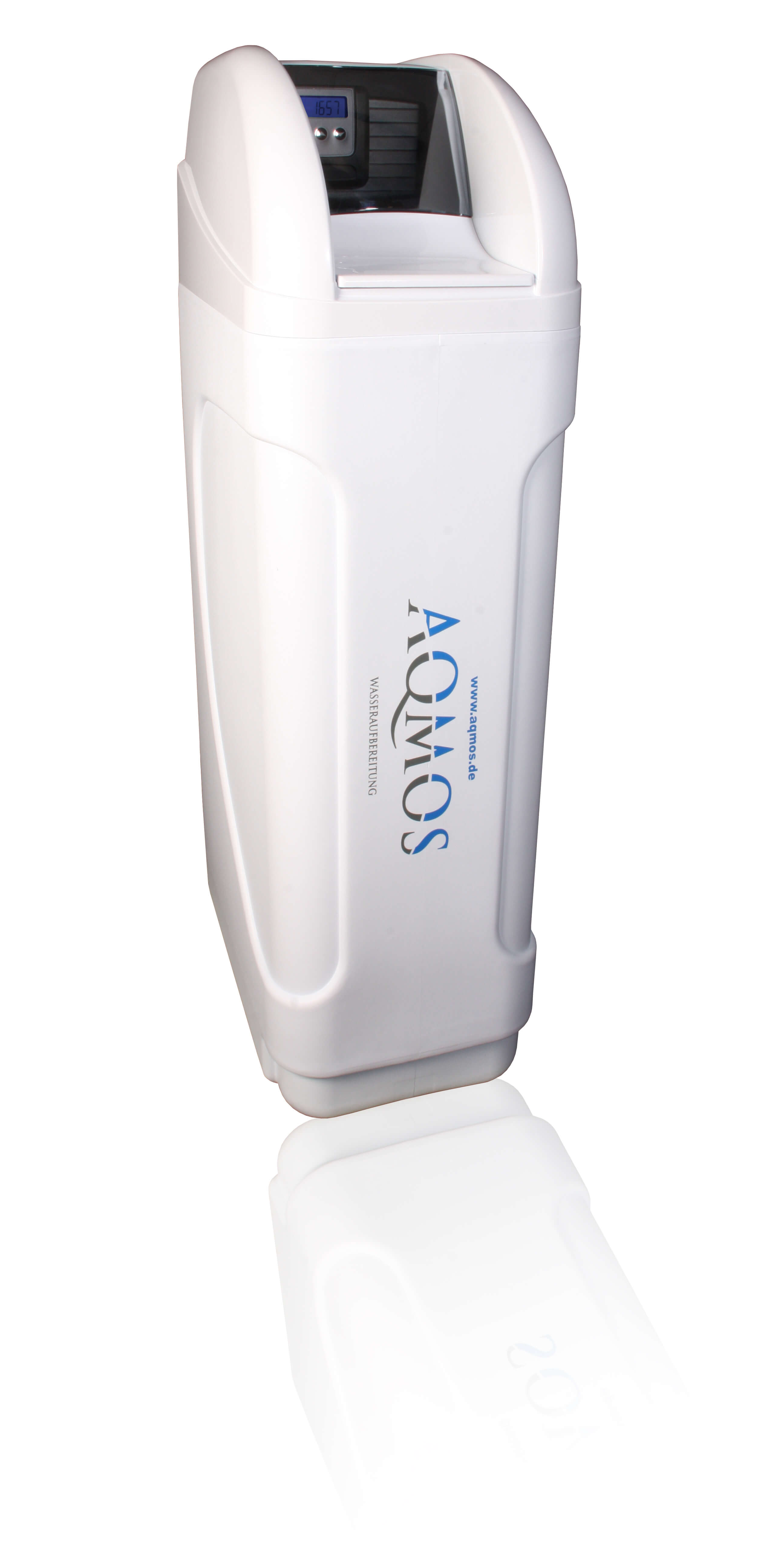 Die Aqmos FM-60 besteht aus einem Kabinettgehäuse mit abnehmbarem Deckel. In dem Kabinett ist eine GFK- Druckflasche eingebaut, welche mit hochwertigem Ionenaustauscher-Harz gefüllt ist. Das Kabinettgehäuse wird gleichzeitig als Regeneriersalzbehälter zur Solebereitstellung (Kochsalzlösung) benutzt und kann ein Salzvorrat von max. 70kg aufnehmen. Komplettiert wird die Anlage durch ein wassermengengesteuertes Ventil FLECK 5600 SXT, welches auf der GFK-Druckflasche montiert ist. Das Steuerventil Fleck 5600 SXT ist aus fieberglas verstärktem Kunststoff (Noryl®) gefertigt und verfügt somit über ein korrosionsbeständiges Material. Das Multifunktions-Steuerventil besitzt eine einfach zu bedienende Micro-Prozessor-Steuerung mit einer Bedienung über drei Tasten. Alle Einstellungen sind leicht programmierbar. Das blau leuchtende LCD-Display zeigt wichtige Informationen wie z.B. Anzeige der Rest-Kapazität, Regenerationszyklen und Zykluszeitan. Das Feinverschneidungsventil ist bereits integriert.