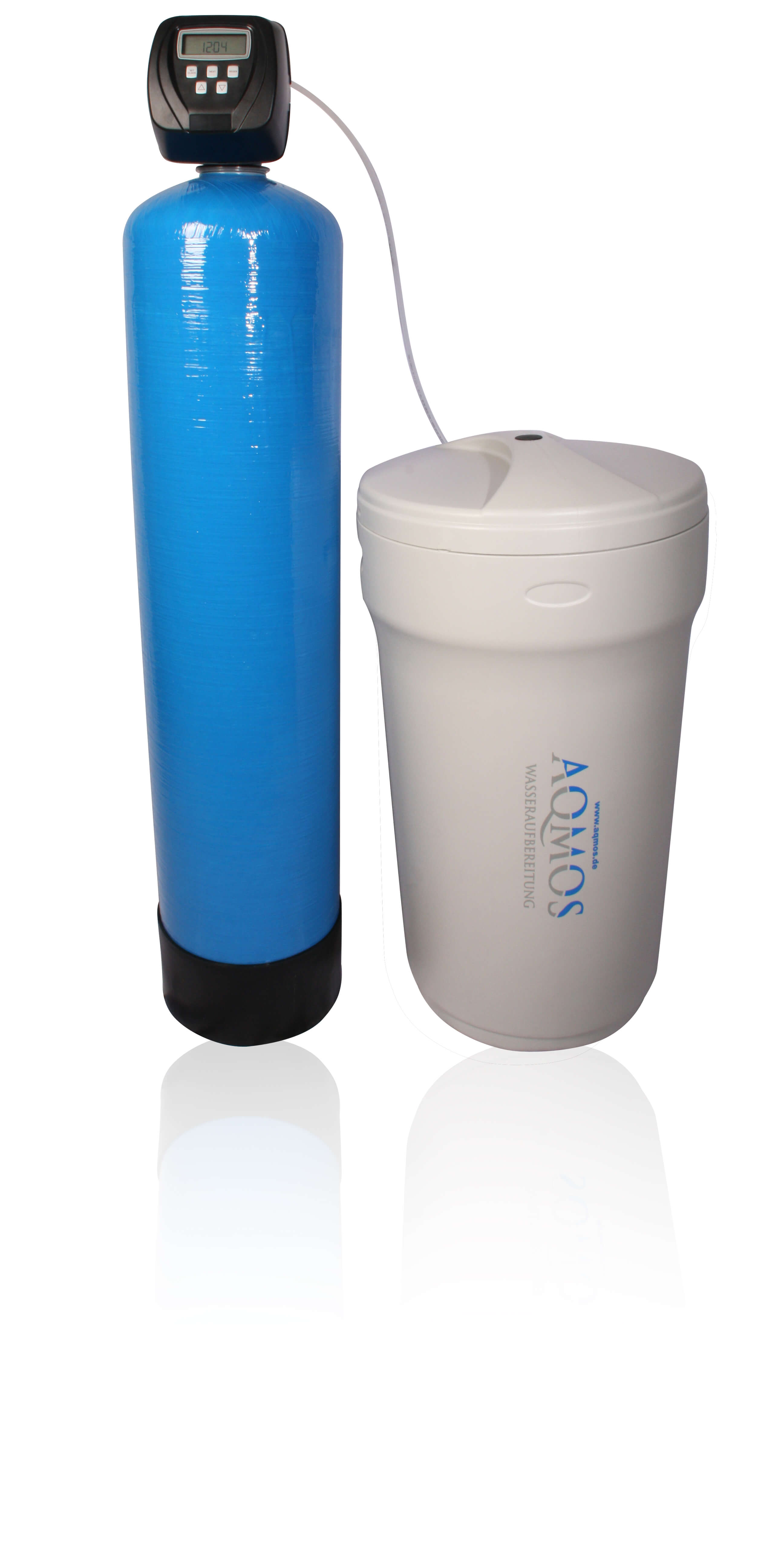 Die Einzelenthärtungsanlage Aqmos CMX-200 ist für Haushalte bis zu 12 Personen ausgelegt und enthärtet bei 10°dH Eingangswasserqualität bis zu 20.000 Liter Wasser pro Regenerationszyklus. Sie funktioniert nach dem Ionenaustausch-Verfahren, d.h. sie tauscht die „Härtemineralien“ Calcium (Ca2+) und Magnesium (Mg2+) anteilig durch Natrium-Ionen (Na+) aus. Der Kalk wird somit entfernt und das Ergebnis ist weiches Wasser.